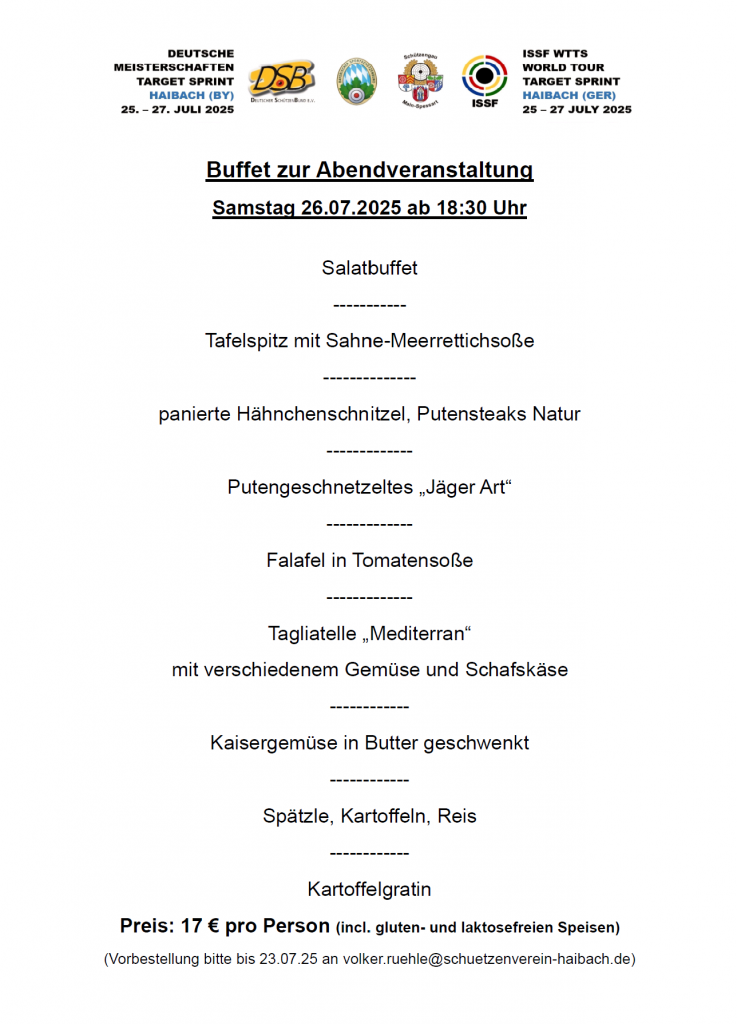 Bei der Abendveranstaltung sorgen wir auch für das entsprechende Abendessen mit einem großen Foodtruck eines Vereinsmitgliedes von uns. Nach der Siegerehrung bieten wir noch eine Tanzparty mit Cocktailbar uvm. Anmeldung zu Buffet bitte bis 23.07.2025!
